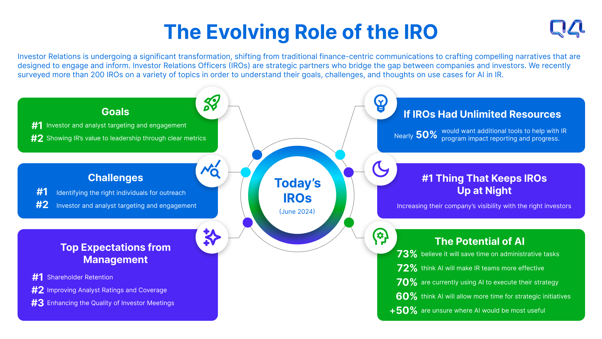 Darrell Heaps, Founder and CEO of Q4, stated, “Through our recent survey and in discussions with our existing clients, including members of our client advisory board, we understand the challenges that IROs face and are committed to providing them with the tools they need to succeed. In order to mitigate some of the issues IROs are facing, our research found that there is a need for education around how technology, including AI, can help to increase efficiency.”
