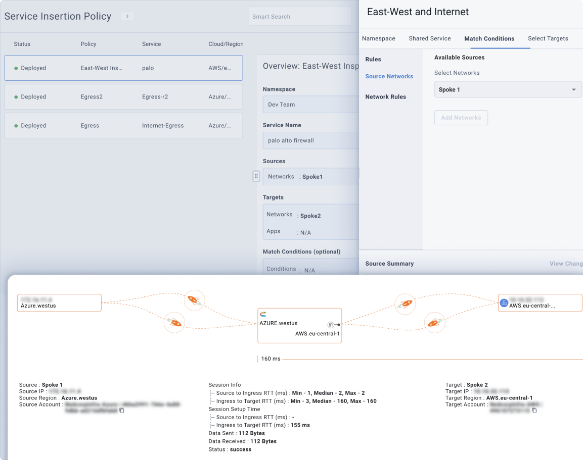 Die meisten Integrationen konzentrieren sich heute auf die Orchestrierung von Firewalls und deren Einfügung in den Pfad des Cloud-Netzwerkverkehrs, wobei sie sich auf IP-Adressen/Portnummern zur Umleitung des Datenverkehrs verlassen. Prosimo bietet stattdessen Richtlinien für das Einfügen von Diensten, mit denen Benutzer ausgefeilte Regeln definieren können, die bestimmen, welcher Datenverkehr zur erweiterten Prüfung an die Firewall weitergeleitet wird.