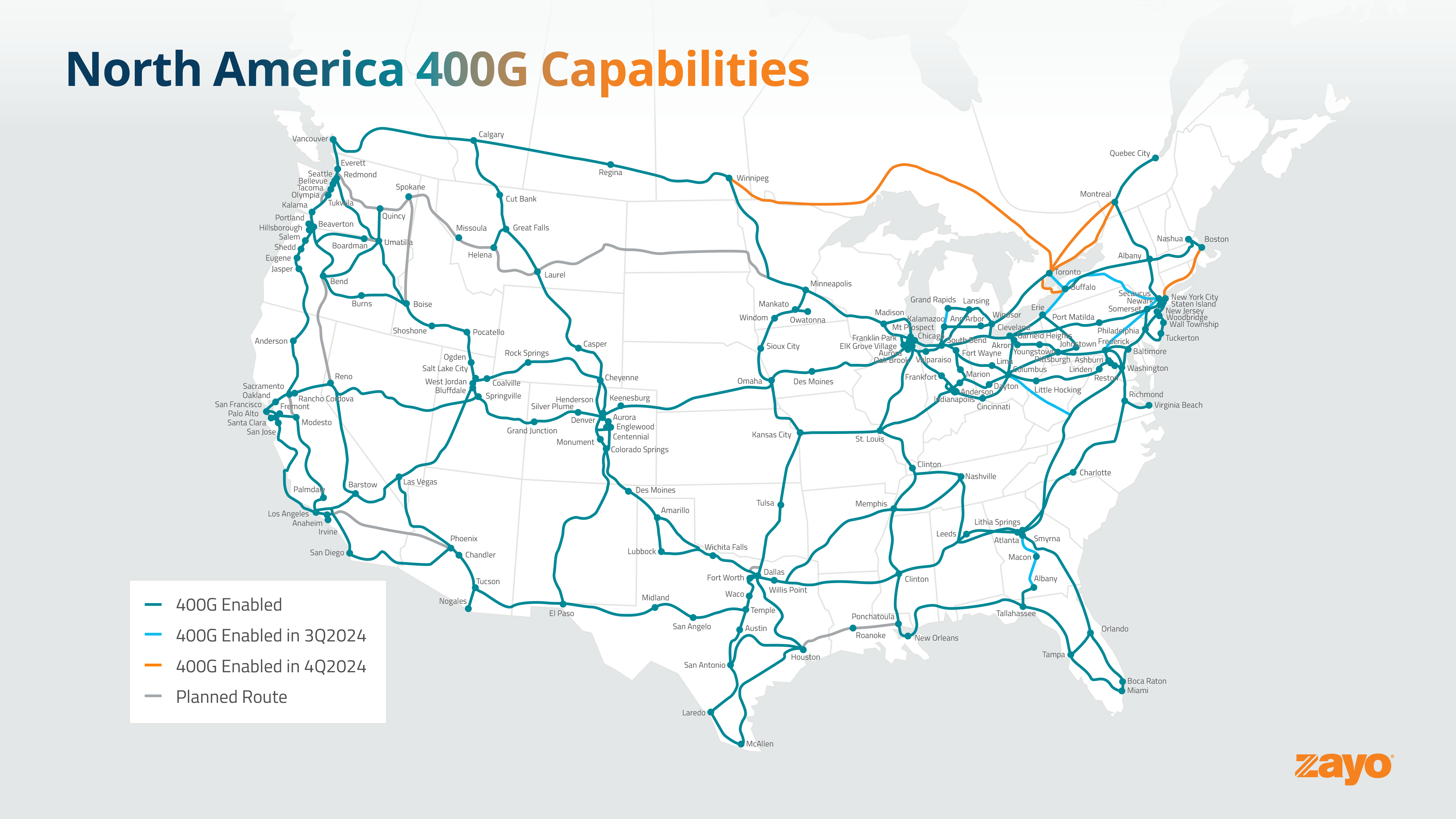 Zayo a également augmenté la capacité 400G sur quatre routes reliant des villes clés, notamment Richmond, Cleveland et Chicago. Zayo fournit actuellement le plus grand réseau 400G en Amérique du Nord. Avec l’achèvement de ces liaisons, le réseau de fibre optique nord-américain de Zayo est désormais compatible 400G à près de 90 % et devrait être l’un des plus importants entièrement compatibles 400G d’ici la fin de 2024.