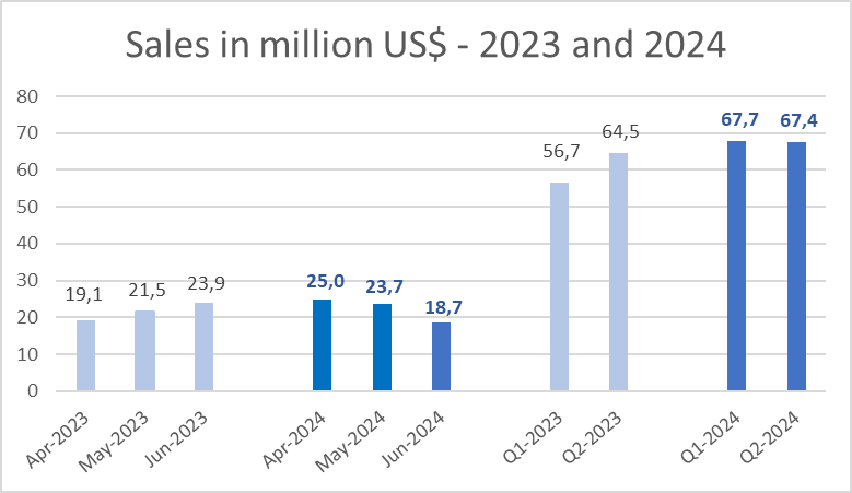 - Die angelieferte Erzmenge blieb weiterhin hoch. Die Gesamtmenge des angelieferten Erzes erreichte in Q2-2024 42.883 Tonnen, verglichen mit 45.730 Tonnen im selben Zeitraum des Vorjahres.