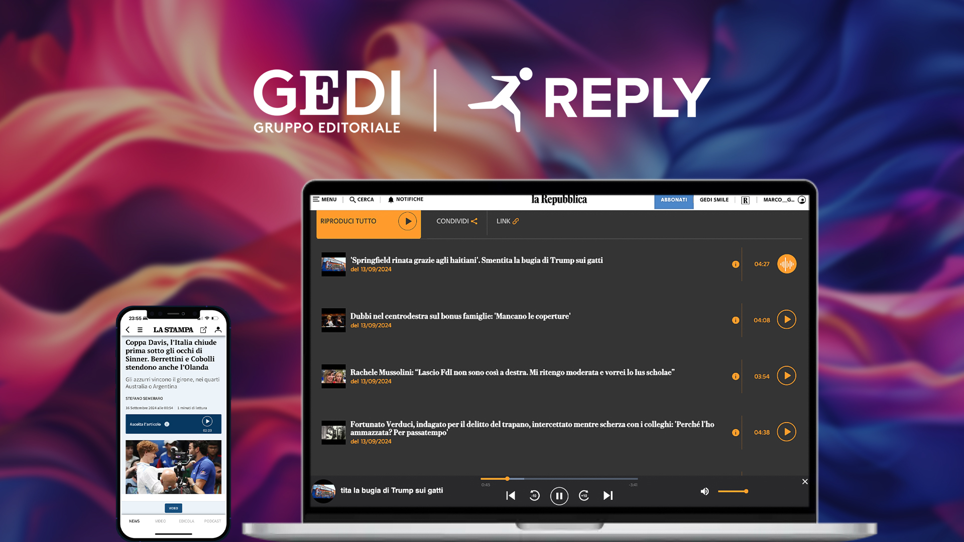 Fabiano Begal, CEO von GEDI Digital, erklärt: „Mit Voice Studio können wir der wachsenden Nachfrage nach qualitativ hochwertigen Audio-Inhalten gerecht werden, wie wir bereits mit dem Erfolg von OnePodcast gesehen haben. Durch die Zusammenarbeit mit Discovery Reply erweitern wir unser redaktionelles Angebot und bieten unseren Lesern ein weiteres innovatives Tool.“