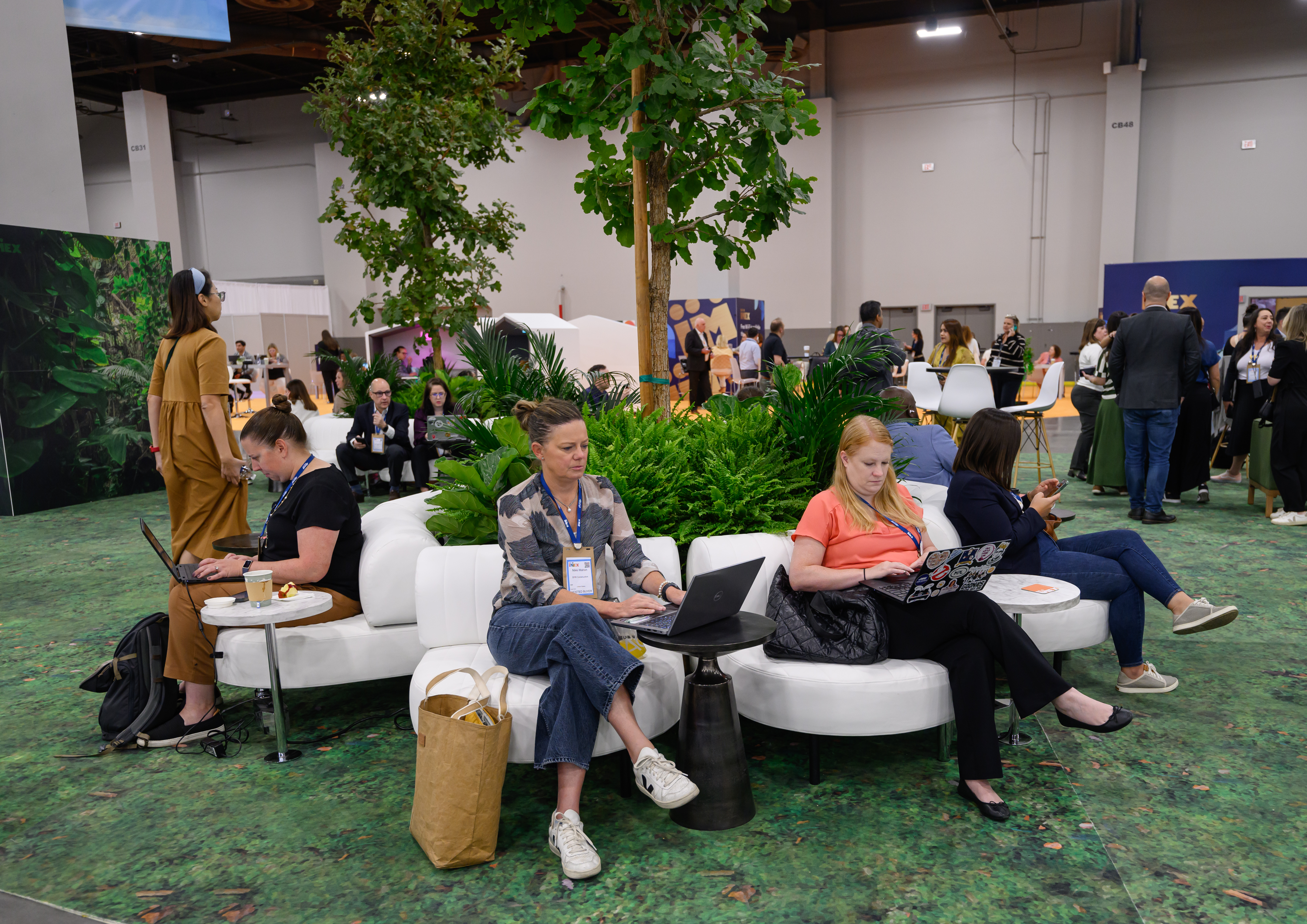 “Attendees need a place to relax, recharge, and even catch up on work during events,” Dana explained. Through thoughtful furniture arrangements, areas for focused work or personal downtime can be achieved, providing a sense of enclosure in a semi-private space. These designs allow attendees the flexibility to choose their own adventure and keep up with work and life demands while remaining part of the event’s overall energy.