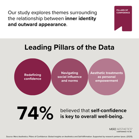 北卡羅來納州羅利--(BUSINESS WIRE)--(美國商業資訊)-- 全球最大的專業醫美企業Merz Aesthetics今日公布了其首項全球研究—— 自信的支柱:關於美容與自我肯定的全球洞察 的結果。該研究探討了自信在日常生活和整體幸福感中所起的作用,以及我們的內在自我與外在表現之間的聯繫。