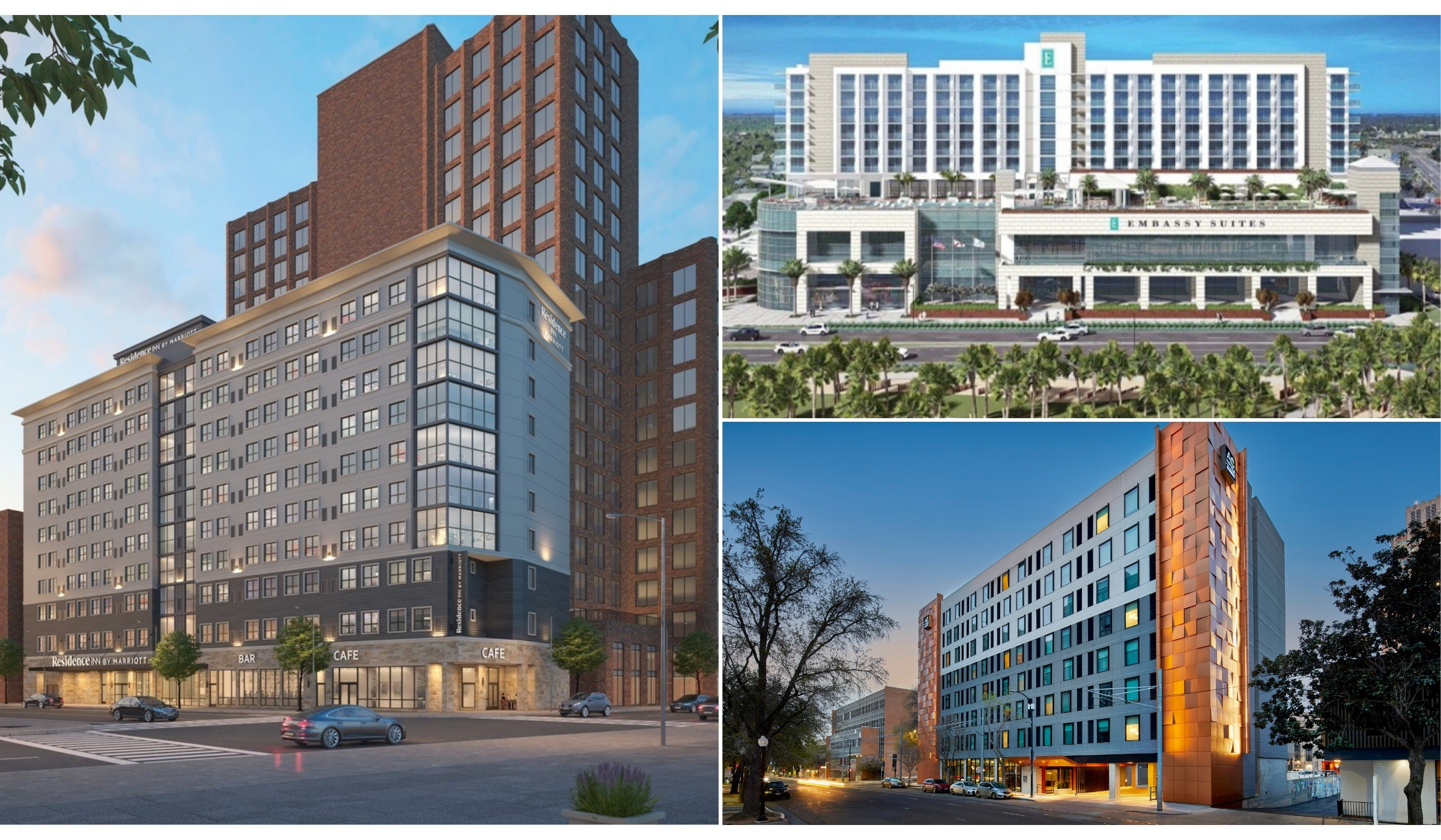 Peachtree Group (“Peachtree”) announced that the firm surpassed $2 billion in hotel development, bringing its total development portfolio to 48 hotels nationwide. Pictured clockwise from left to right: Residence Inn by Marriott, San Antonio, Texas; Embassy Suites, Gulf Shores, Alabama; AC Hotel by Marriott, Sacramento, Calif. (Photo: Business Wire)