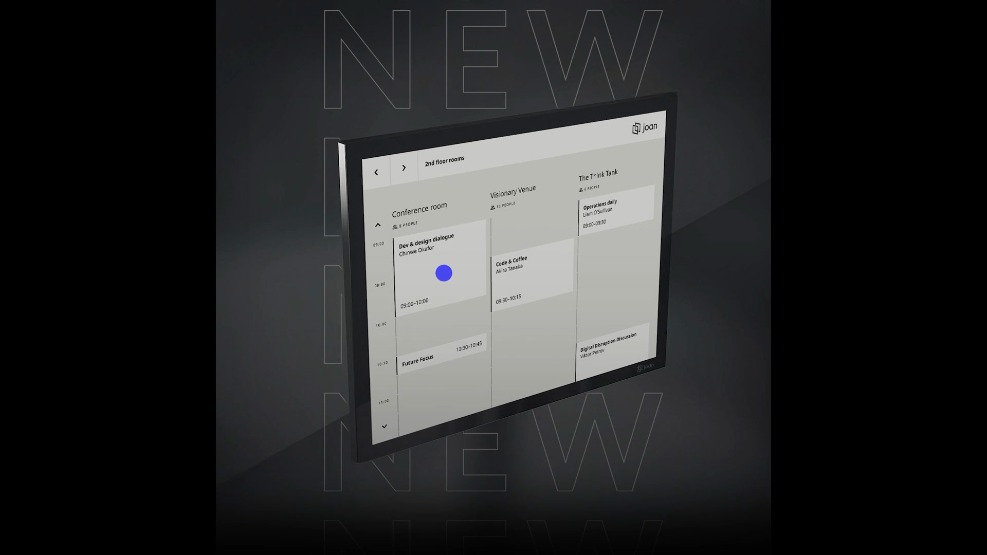 Dank Joan 13 Pro können Organisationen alle ihre Besprechungsräume in einem Planer anzeigen und über das großformatige Touch-Display sofort einen verfügbaren Raum buchen. Die Bedienung des Terminplaners ist äußerst intuitiv, die Sichtbarkeit der Räume wird verbessert, nahtlose Buchungen erleichtert und die Verwaltung der Besprechungsräume optimiert.