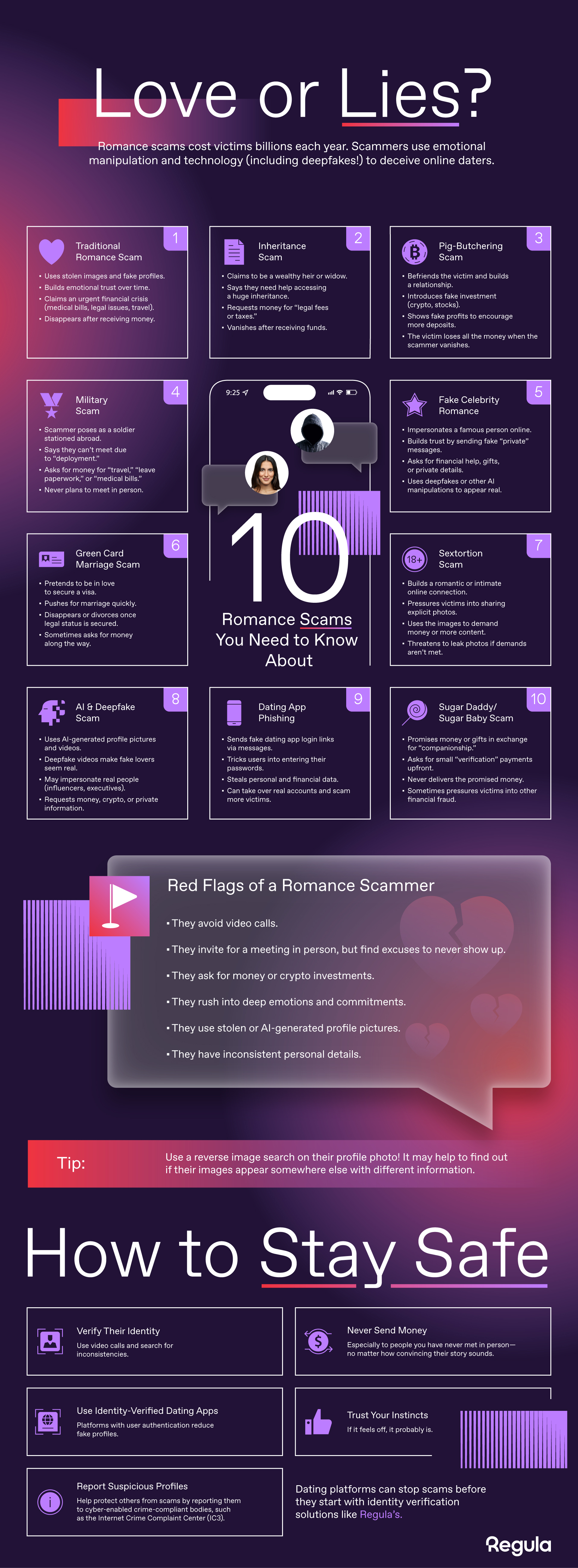 Las estafas románticas adoptan muchas formas y se aprovechan de la confianza y la vulnerabilidad emocional para estafar a las víctimas. Sus tácticas habituales incluyen: