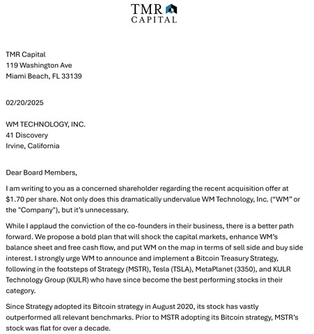 TMR Capital Sends an Open Letter Regarding Opportunistic MBO of WM Technology, Inc. (MAPS) and Urges Company to Buy Bitcoin Instead and Become the MicroStrategy (aka Strategy) for Cannabis