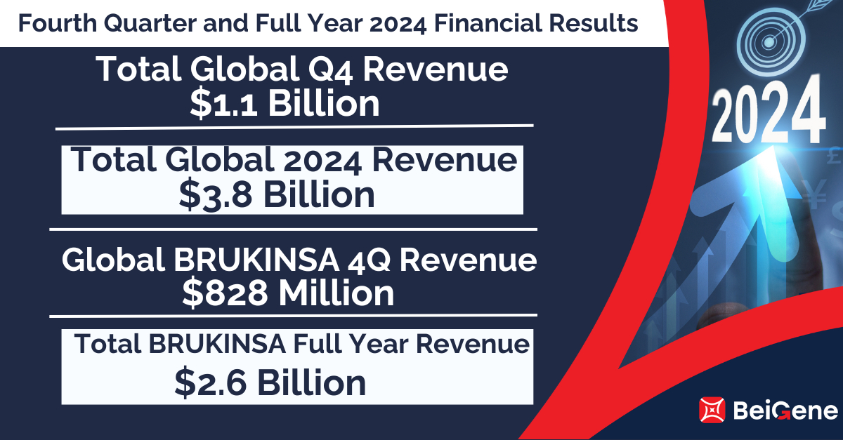 “Nuestros resultados del cuarto trimestre y del año completo demuestran nuestro tremendo crecimiento como potencia mundial en oncología, reforzado por el éxito continuo de BRUKINSA y el desarrollo de una de las líneas de investigación en tumores sólidos más prolíficas en oncología, con múltiples lecturas de datos previstas para este año”, dijo John V. Oyler, cofundador, presidente y director ejecutivo de BeiGene. “BRUKINSA es ahora el líder inequívoco en nuevos inicios de tratamiento para pacientes con LLC en los EE. UU., tiene la etiqueta más amplia de todos los inhibidores de BTK y sirve como piedra angular de nuestra franquicia de hematología, mostrando una inmensa promesa como columna vertebral junto con nuestro inhibidor de BCL2 en etapa avanzada, sonrotoclax, y nuestro potencial CDAC BTK de primera clase. También estamos construyendo futuras franquicias de tumores sólidos en cánceres de mama, pulmón y gastrointestinales aprovechando nuestras plataformas en anticuerpos multiespecíficos, degradadores de proteínas y conjugados anticuerpo-fármaco. “El año 2025 marca un punto de inflexión, ya que anticipamos lograr un ingreso operativo y un flujo de efectivo operativo GAAP positivos junto con nuestra intención de cambiar nuestro nombre a BeOne con nuestro nuevo símbolo NASDAQ, ONC."