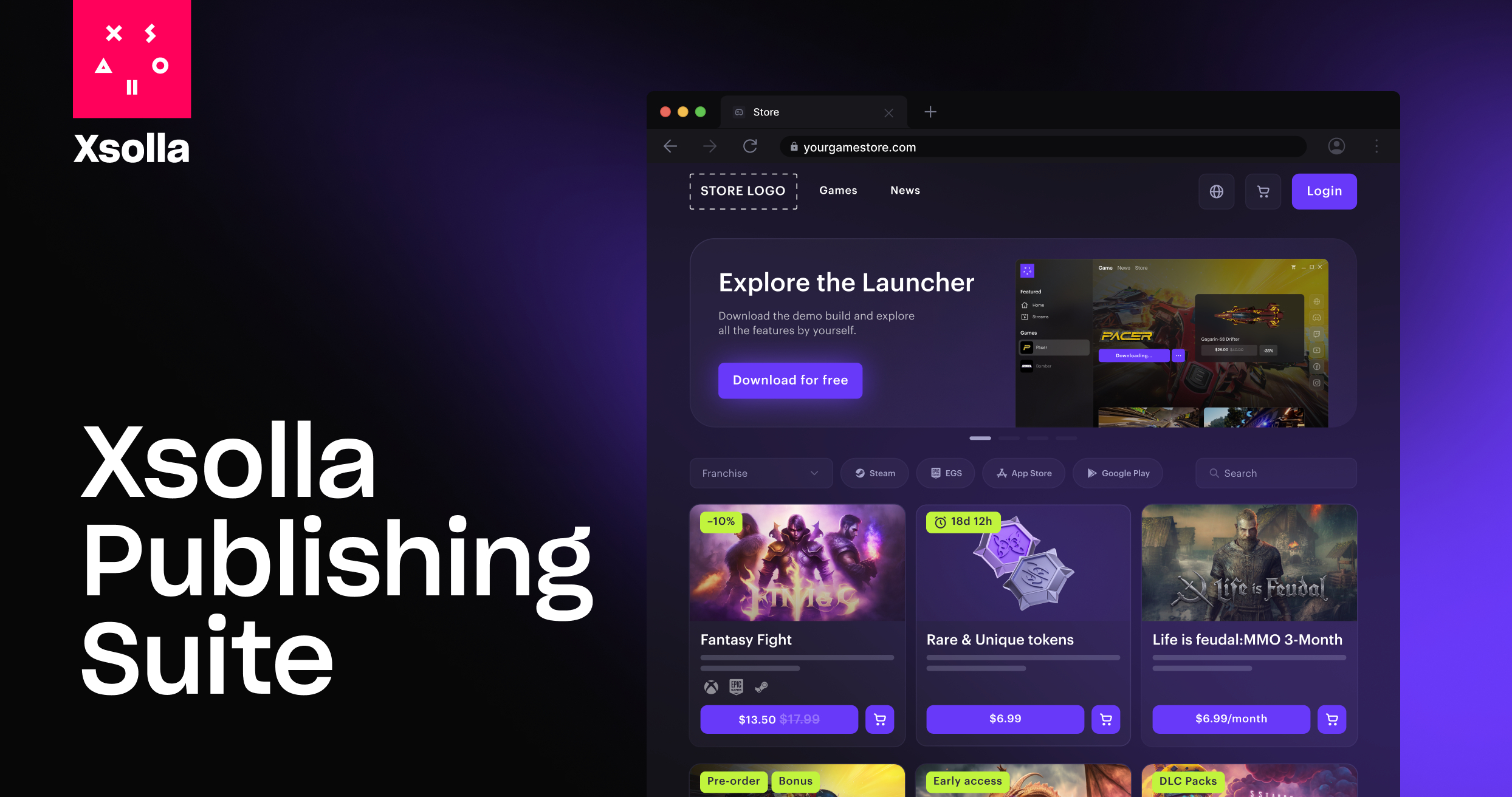 Xsolla Publishing Suite to modułowy zestaw narzędzi oferujący rozwiązania szyte na miarę, aby wspomagać twórców w osiąganiu ich indywidualnych celów: