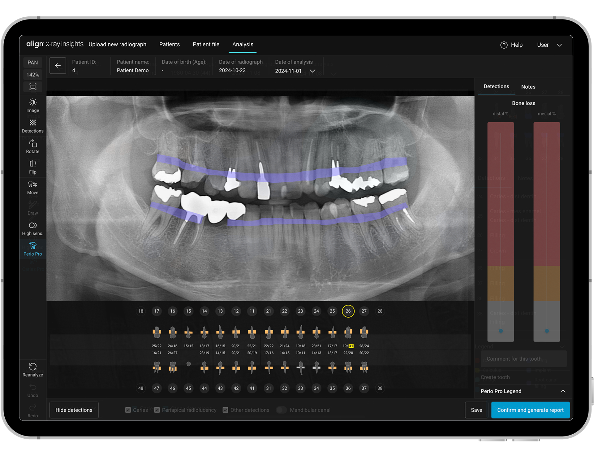Après avoir confirmé le diagnostic, les médecins peuvent utiliser le rapport détaillé d’Align X-ray Insights, le diagramme dentaire automatique et les superpositions colorées des anomalies radiographiques pour l'éducation des patients et la planification des traitements. Les fonctionnalités de détection par IA incluent les caries, les radiotransparences périapicales, la perte osseuse parodontale et d'autres affections.