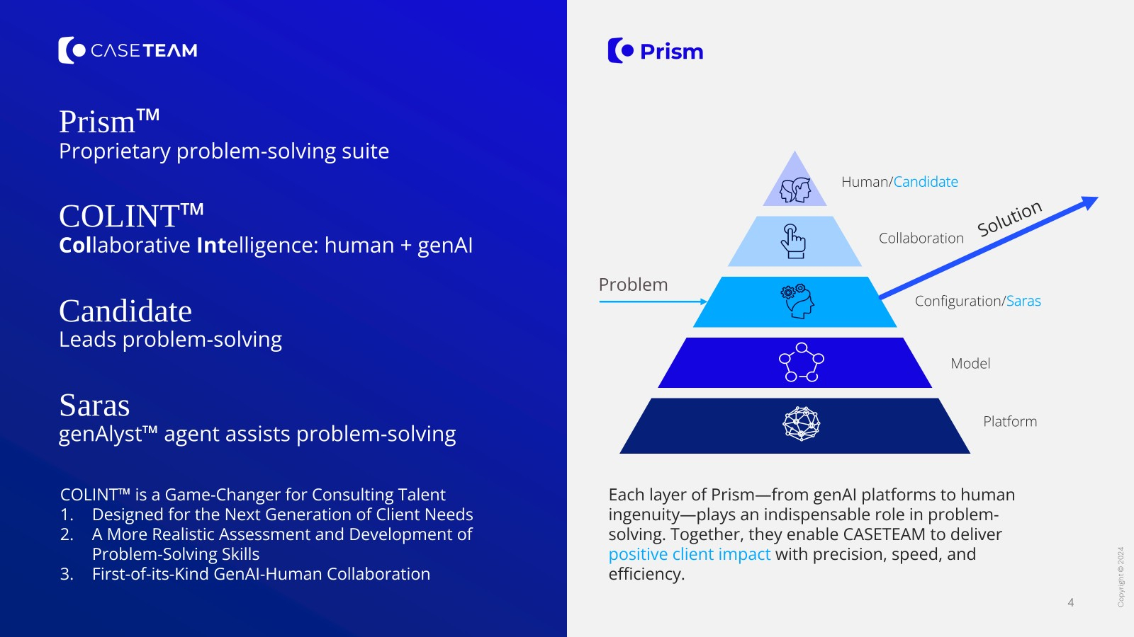 "COLINT is a fundamental shift in how we evaluate and develop talent. Candidates won’t just answer structured case questions—they’ll engage in a dynamic problem-solving session where they must collaborate with AI to frame issues, synthesize research, analyze data, derive insights, develop options, and craft a compelling client recommendation, just as they would in a real client situation," said Srini Bangalore, Founder & Chief Client Officer of CASETEAM.