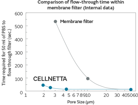 Étude de cas 1 : temps nécessaire pour faire passer 50 ml de solution saline tamponnée au phosphate (PBS) à travers un filtre à membrane avec une taille de pore de 5 µm comparé à CELLNETTA.