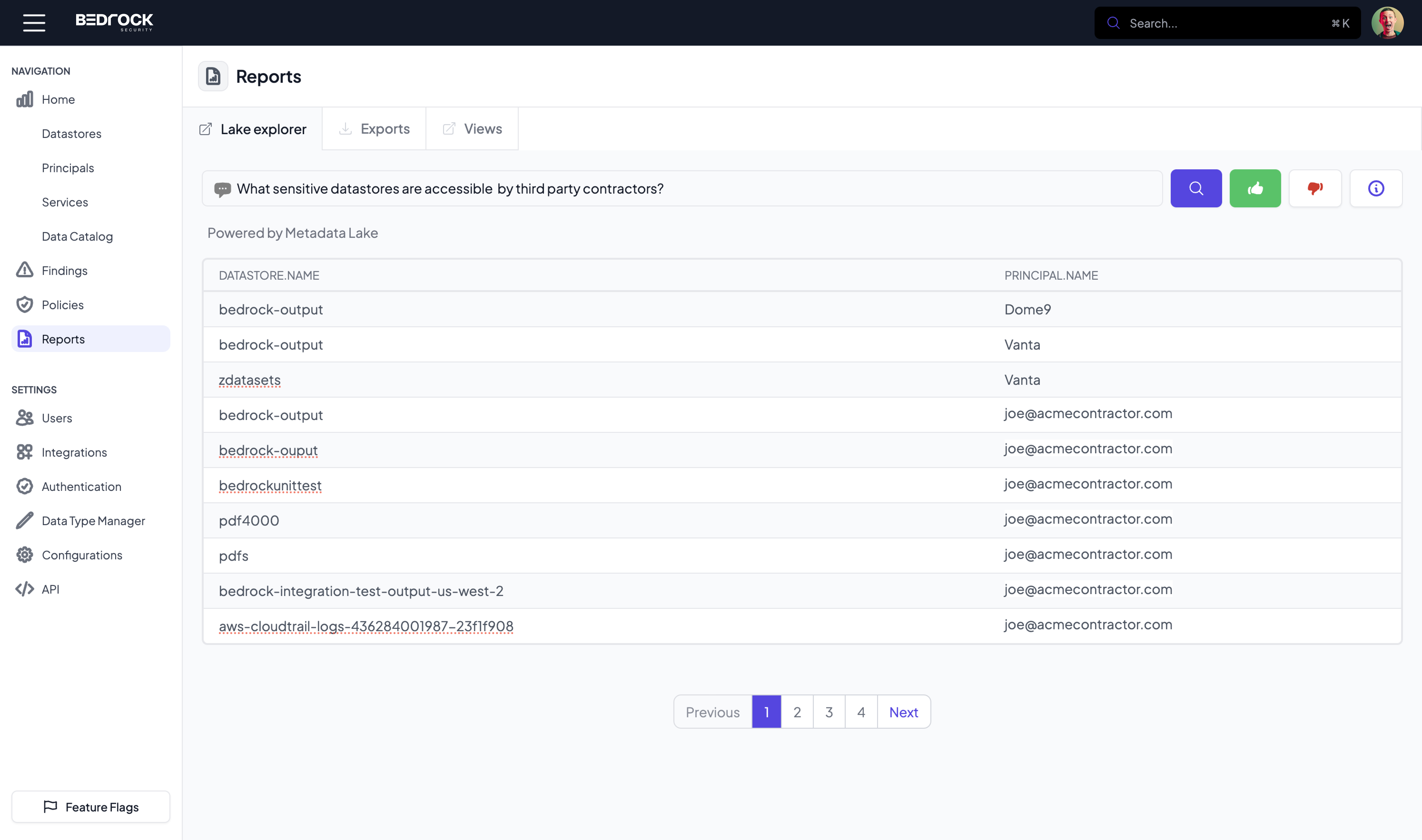 - Bedrock Metadata Lake Copilot makes it simple for teams to interact with the metadata lake and answer complex questions about their data — from identifying sensitive assets to identifying riskiest users.