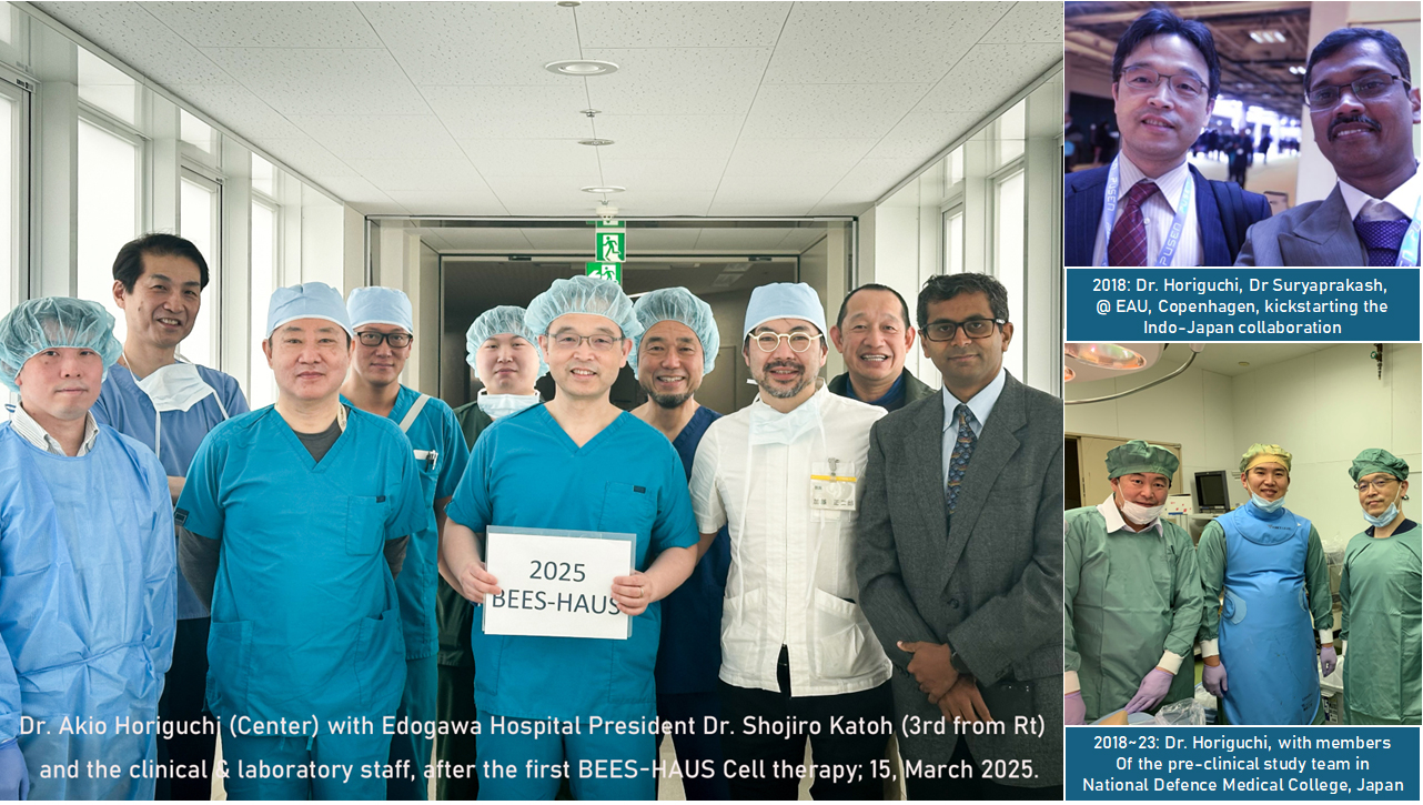 2008年,GN Corp與印度泰米爾納德邦金奈的NCRM啟動了利用頰組織上皮細胞治療角膜失明的研究。2012年,來自印度海德拉巴的泌尿科醫生Suryaprakash博士提出了一個大膽的想法,即應用頰(口腔)黏膜細胞來修復因狹窄受損的男性尿道,這引發了一項臨床研究。他于2017年在東京舉行的NCRM NICHE會議上展示了這項研究的成果,並在2018年的歐洲泌尿外科學會(EAU)會議上與日本國防醫科大學(NDMC)的Akio Horiguchi博士會面後,開啟了雙方的合作(右上圖)。在2018年至2023年期間,在NDMC醫學工程系的協助下,確認了在尿道狹窄臨床前模型中細胞成功植入(右下圖)。如今在2025年,東京江戶川醫院已開始進行臨床應用。主圖:東京江戶川醫院首次臨床移植後的BEES-HAUS團隊;Horiguchi博士(中間)和站在他左邊的Shojiro Katoh博士(江戶川醫院院長)。