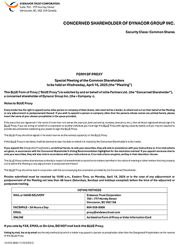 Shareholders who do not receive a circular and proxy may contact us at proxy@endeavortrust.com. The circular with respect to the Meeting will be made available at www.sedar.com and at www.iolitecapital.com/dynacor.