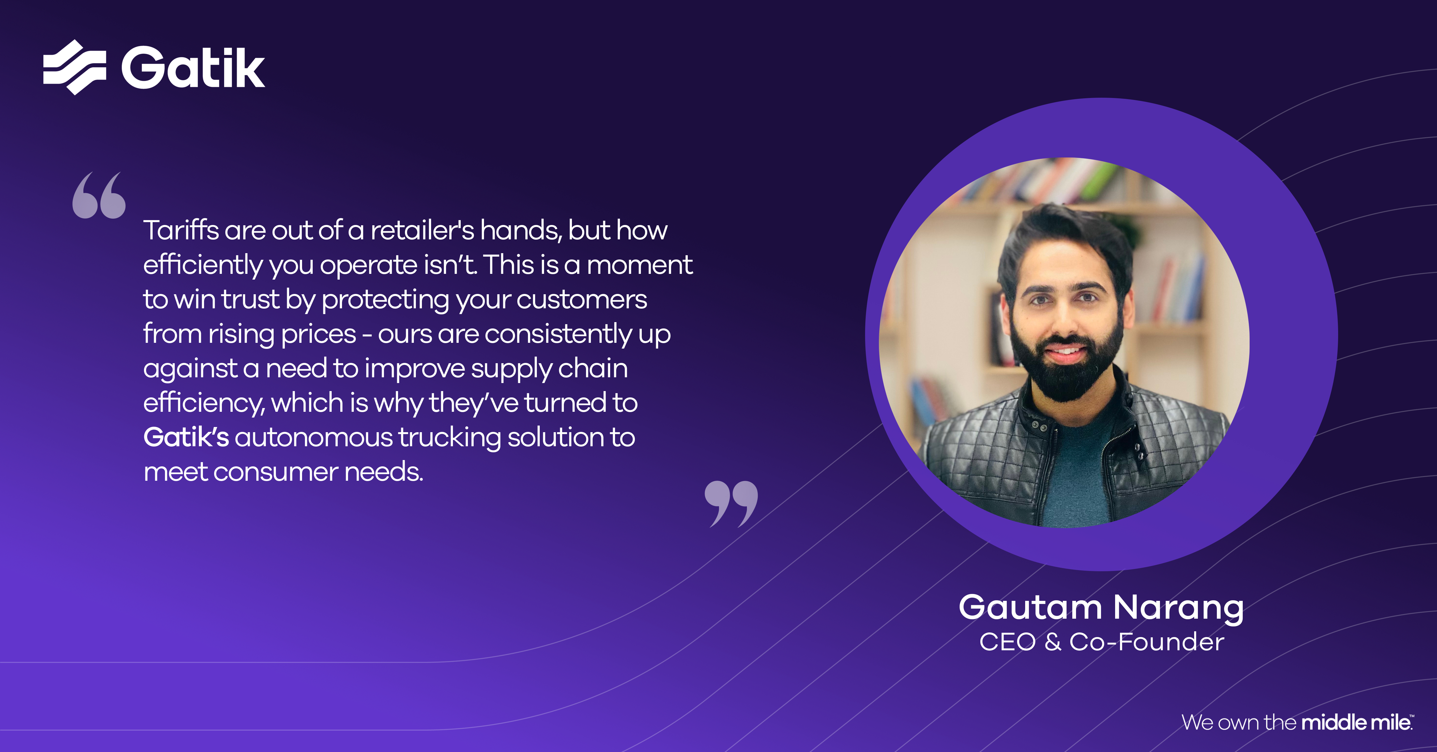 “Tariffs are out of a retailer’s hands,” said Gautam Narang, CEO and co-founder, Gatik. “But how efficiently you operate isn’t. This is a moment to win trust by protecting your customers from rising prices - not just through promotions, but by eliminating the hidden costs you used to overlook. Our customers are consistently up against a need to improve supply chain efficiency, which is why they’ve turned to Gatik’s autonomous trucking solution to meet consumer needs.”