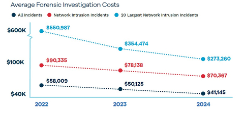 - Forensic investigation costs dropped dramatically, marking a three-year low and a 30% reduction. In just the past two years, the average forensic costs for the 20 largest network intrusion matters declined from $550,000 to $273,000.