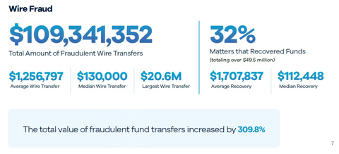 - Wire fraud impact grew. The total amount of fraudulent transfers grew by over 300%, from $35 million in 2023 to $109 million in 2024. The average fraudulent wire transfer was over $1 million.