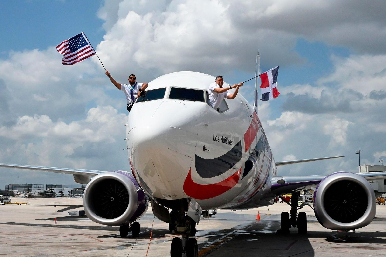 The Dominican airline landed at Miami International Airport with 189 passengers on a Boeing 737 Max 8 named Los Haitises, which features the national flag drawn along the aircraft's fuselage.