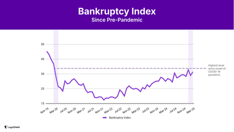 "Bankruptcy inquiries hit the highest we've seen since early 2020, just before Americans' checkbooks were boosted by COVID checks from the government," said Matt Layton, LegalShield senior vice president of consumer analytics. "When you combine record debt, rising delinquencies, and prolonged financial stress, topped by price pressures driven by tariff uncertainty, the risk of a summer surge in bankruptcy filings becomes very real."
