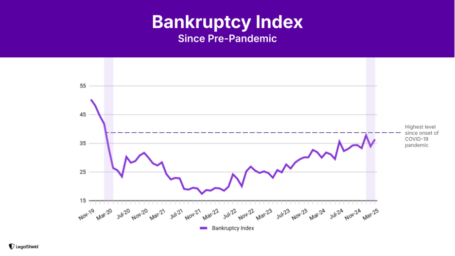ADA, Okla.--(BUSINESS WIRE)--Bankruptcy inquiries surged in the first quarter to their highest level since early 2020, signaling a potential summer wave of filings, LegalShield reported today. The legal service provider's data, historically a leading indicator of bankruptcy and other consumer financial trends, suggests record consumer debt and new tariffs could push financially strained households past their breaking point.