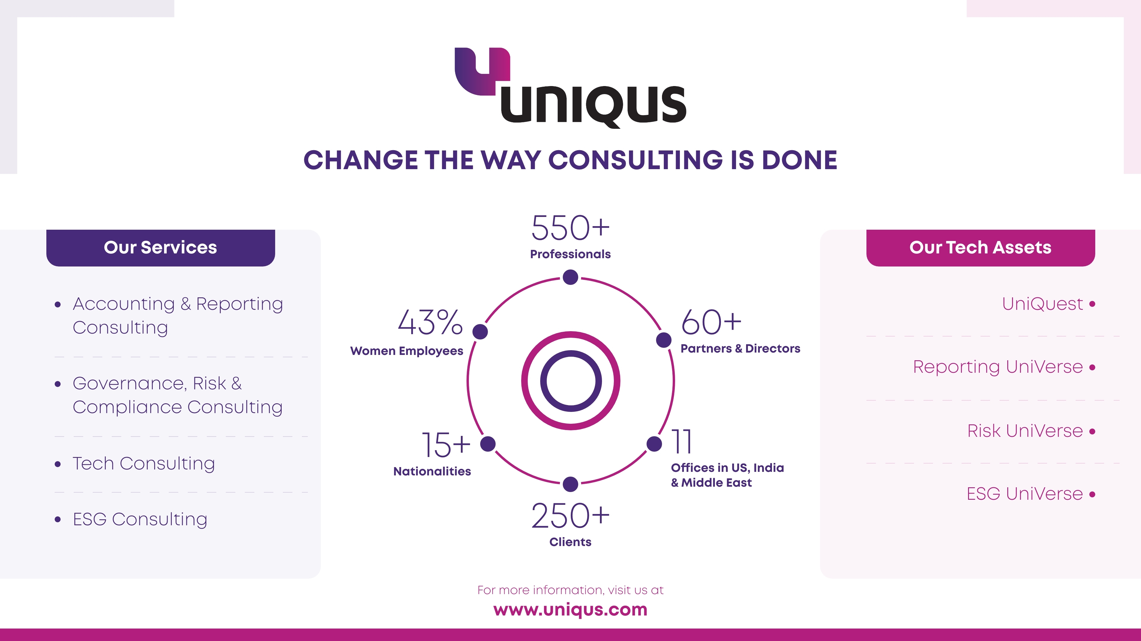 Uniqus Consultech is a global tech-enabled consulting company that specializes in Accounting & Reporting, ESG, and Tech Consulting. The Company is co-founded by consulting veterans Jamil Khatri and Sandip Khetan and backed by marquee investors such as Nexus Venture Partners, Sorin Investments, UST, and other angel investors globally. Anu Chaudhary, a global ESG specialist with over 20 years of experience, serves as the Global Head of ESG. Abhijit Varma, a veteran technology specialist, leads Tech Consulting globally.