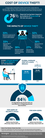 BURLINGAME, Calif.--(BUSINESS WIRE)--A recent survey of IT decision-makers in the U.S. and Europe found that 76% have been impacted by incidents of device theft in the past two years. The study, which was conducted by market research firm, Vanson Bourne, on the behalf of Kensington, a worldwide leader of desktop computing and mobility solutions for IT, business, and home office professionals, highlighted the impacts on the business operations caused by the device thefts and resulting data breaches.