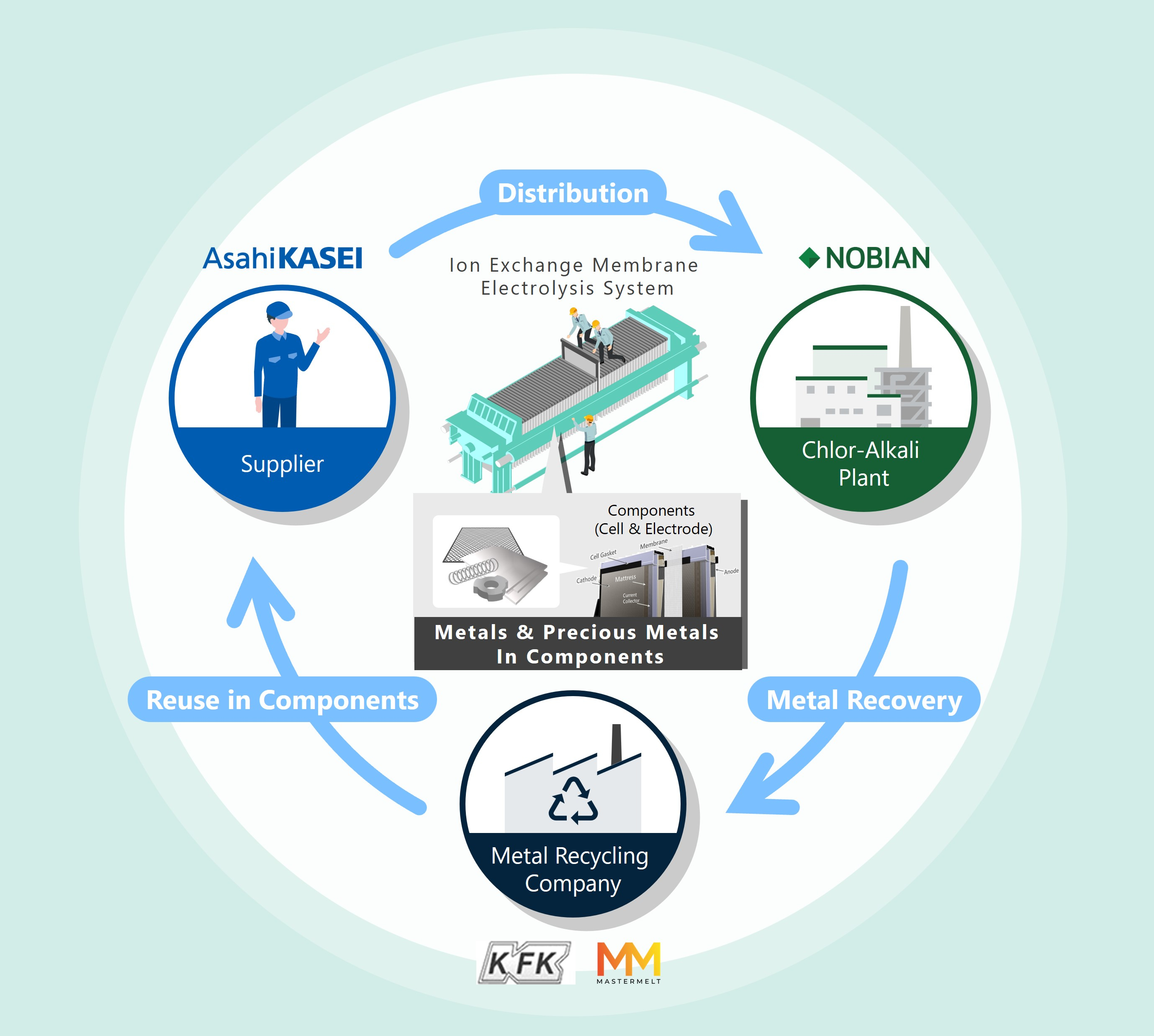 Asahi Kasei has started a joint demonstration with Nobian, Furuya Metal, and Mastermelt on the recycling of metals used in the cells of electrolyzers.