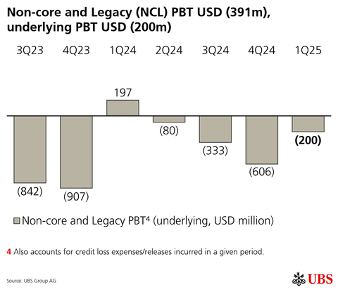 Non-core and Legacy progressed well on its cost-reduction work. It has decommissioned almost 10% of its applications, for a total of 48% since its inception in 2Q23. NCL also continued to exit positions, having now closed 74% of its books since its inception and reduced RWA to USD 34bn at the end of 1Q25.