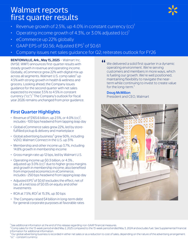 The company will hold a live conference call with the investment community at 7 a.m. CST Thursday, May 15th, 2025, to discuss the company’s first quarter earnings results for fiscal year 2026. The event will be webcast live and is accessible by visiting https://corporate.walmart.com/news/events and selecting the First Quarter Earnings Release event. The webcast will be archived and available on the company website.