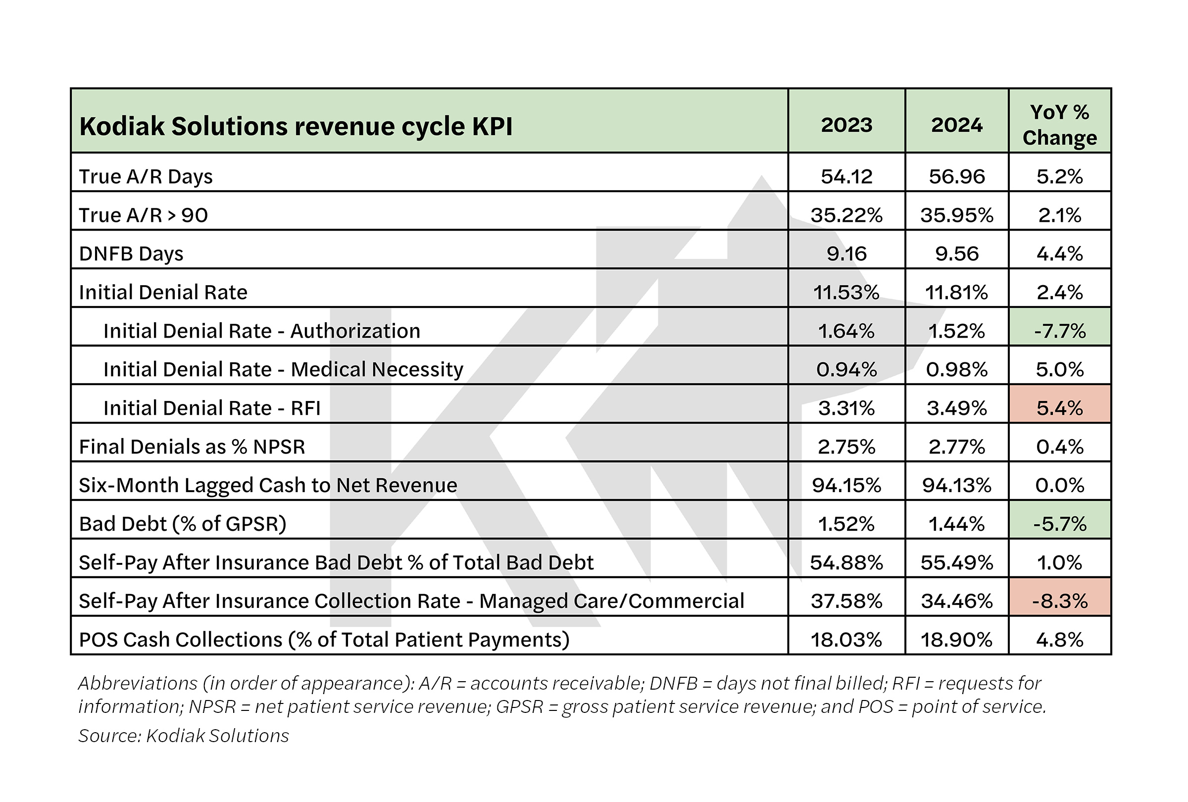 INDIANAPOLIS--(BUSINESS WIRE)--Hospitals, health systems and medical practices faced insurance claims practices that slowed payments for needed medical care in 2024 compared with 2023, new Kodiak Solutions revenue cycle data show.