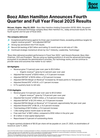 MCLEAN, Va.--(BUSINESS WIRE)--Booz Allen Hamilton Holding Corporation (NYSE: BAH), the parent company of advanced technology company Booz Allen Hamilton Inc., today announced preliminary results for the fourth quarter and full fiscal year 2025.