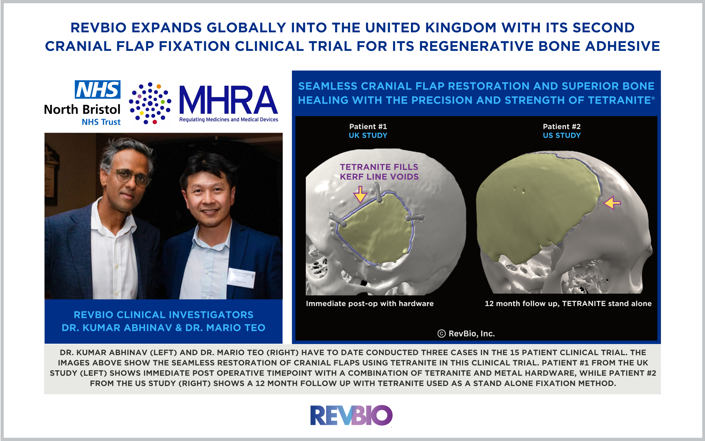 RevBio si estende globalmente nel Regno Unito con il suo secondo studio clinico sulla fissazione dei lembi cranici per il suo adesivo osseo rigenerativo