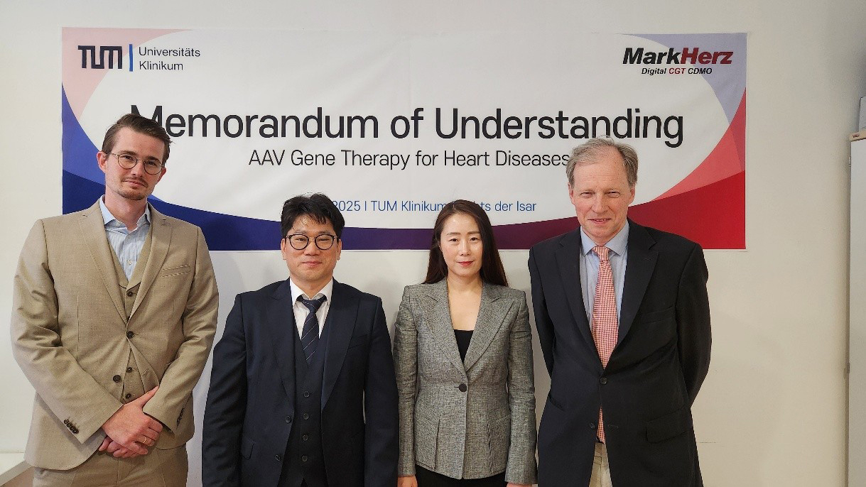 An der Unterzeichnungszeremonie nahmen u. a. teil: Prof. Dr. med. Christian Kupatt (TUM), ein führender Experte für kardiovaskuläre Gentherapie; Patentanwalt Dr. Rudolph Schön von Neymeyr & Partner; Dr. Seungmin Lee (Dr. Mark Lee), CEO von MarkHerz; sowie Jeongseo Baek (Grace Baek), Leiterin der deutschen Niederlassung von MarkHerz.