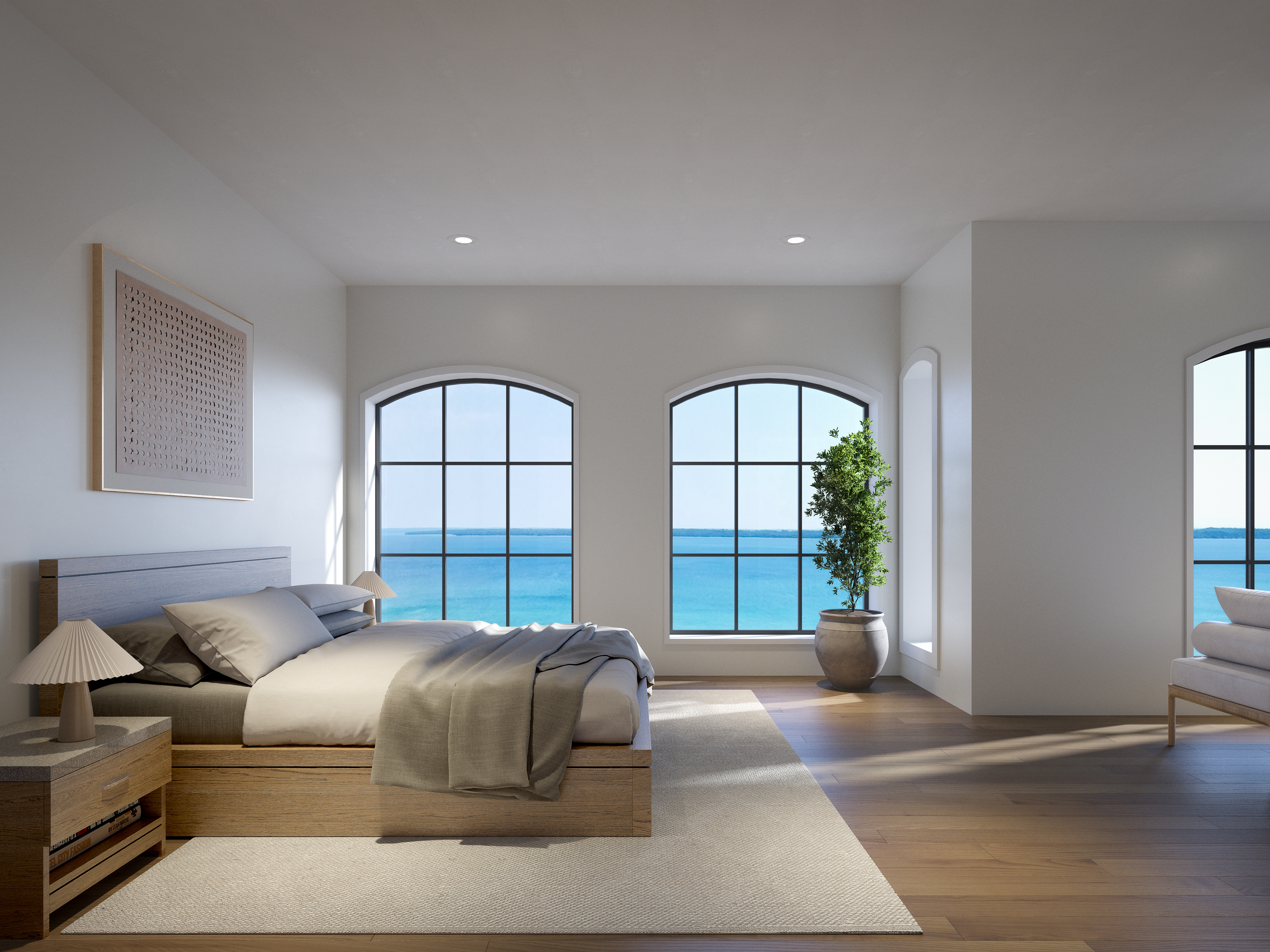 The primary bathrooms feature honed Dolomite stone, a spacious shower, heated floors, and a solid oak double vanity with a Carrara marble top. The primary suite enjoys uninterrupted views of Grand Traverse Bay, an ever-changing canvas of shimmering water and light. A separate reading nook offers a quiet perch to take in the bay. The lower level is designed for both relaxation and entertaining with seamless access to the outdoor terrace and private boat slip.