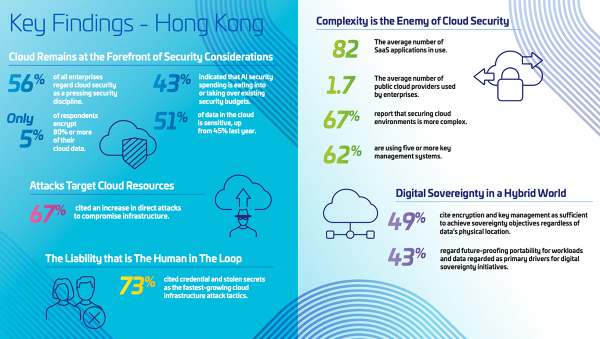 - 全球有55%的企業報告稱,雲端環境比本地基礎架構更難保障安全;而香港的比例為67%