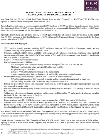 NEW YORK--(BUSINESS WIRE)--KKR Real Estate Finance Trust Inc. (“KREF”) (NYSE: KREF) today reported its second quarter 2025 results, which have been posted to the Investor Relations section of KREF’s website at http://www.kkrreit.com/investor-relations/events-and-presentations.