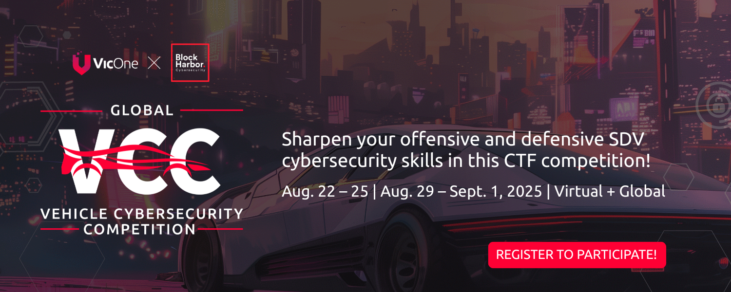 DETROIT--(BUSINESS WIRE)--VicOne, an automotive cybersecurity solutions leader, and Block Harbor, a trusted automotive cybersecurity engineering company, today launched the Global Vehicle Cybersecurity Competition (VCC), to take place online Aug. 22-25 and Aug. 29-Sept. 1. Participants in the “Capture the Flag”-style event will compete head-to-head in both offense and defense scenarios mimicking real-world attacks and countermeasures on modern connected vehicles and software-defined vehicles (SDVs). The overall VCC competition winner will be sponsored to attend Pwn2Own Automotive 2026, the world’s largest zero-day vulnerability discovery contest focused on connected cars and software-defined vehicles (SDVs). Pwn2Own Automotive 2026 is scheduled for Jan. 21-23, 2026, at Automotive World in Tokyo.