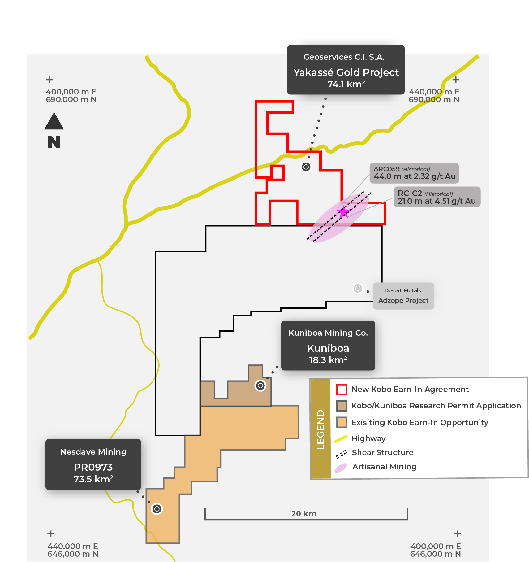 Edward Gosselin, chef de la direction et administrateur de Kobo a commenté : « Notre convention d’acquisition de participation à l’égard du projet Yakassé marque une étape importante dans la stratégie de Kobo visant à élargir notre portefeuille d’exploration dans une des régions aurifères prometteuses de Côte d’Ivoire. Ce projet s’inscrit dans une zone structurellement complexe et sous-explorée qui a déjà obtenu des résultats de haute teneur à la suite de forages effectués dans le passé par des exploitants réputés. Compte tenu de son fort potentiel régional prévu et de son infrastructure bien développée, le projet Yakassé s’aligne sur notre stratégie de croissance à long terme. Sous réserve de l’approbation de la demande en cours, nous nous réjouissons à la perspective de poursuivre l’exploration dans le cadre de ce projet avec Geoservices alors que nous continuons de vouloir tirer parti de nouvelles occasions parallèlement au développement de notre projet phare de Kossou. »
