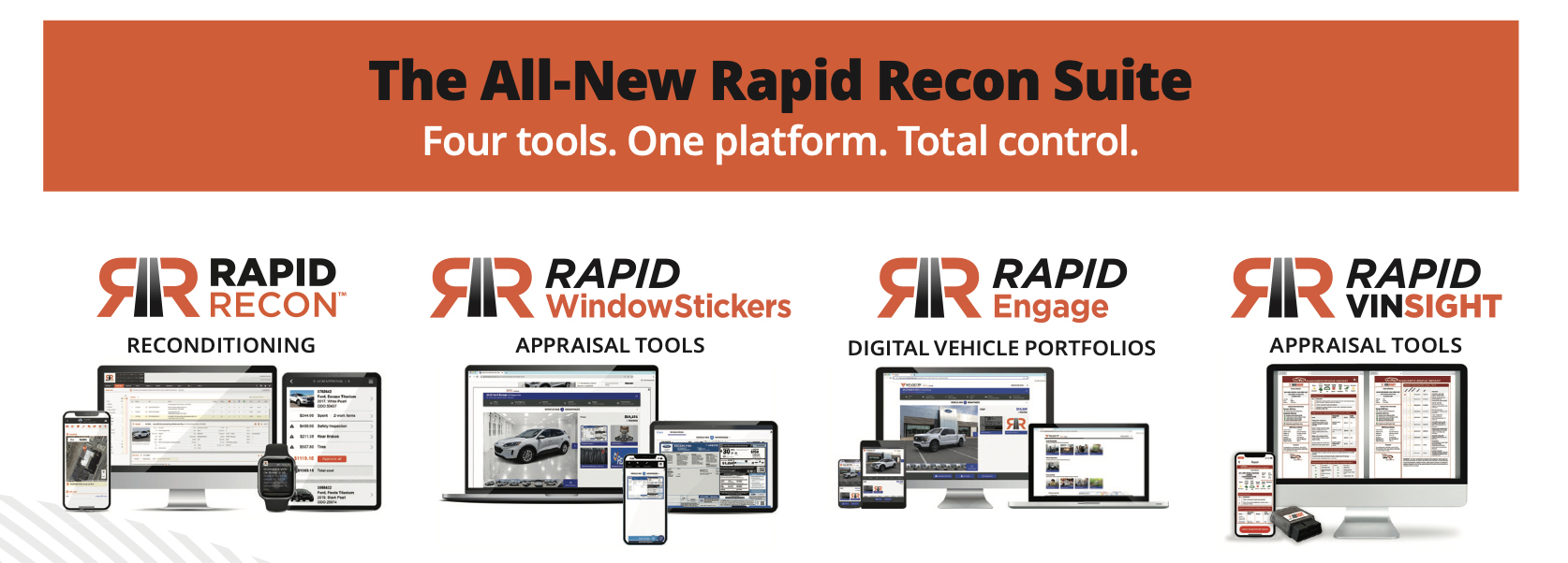 RapidRecon Pro, the gold standard in reconditioning workflows, now integrates seamlessly with Rapid’s comprehensive suite of products. With a single sign-on experience, dealerships can access RapidRecon Pro, Rapid WindowStickers, Rapid Engage, and Rapid VinSight, unlocking in-depth vehicle insights and streamlining operations like never before. To learn more, visit www.rapidrecon.com.