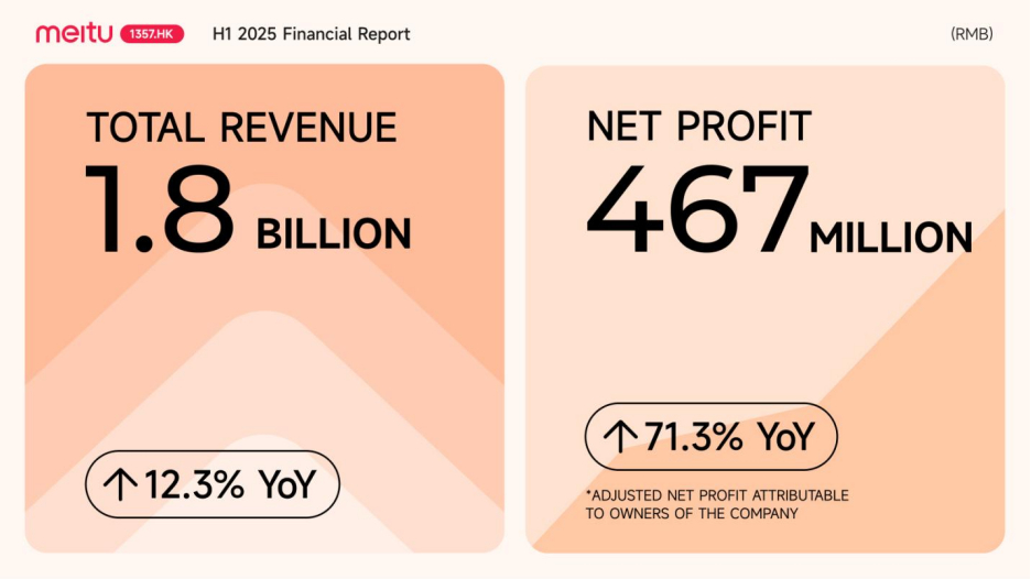 HONG KONG--(BUSINESS WIRE)--Meitu, Inc. (1357.HK), une société technologique cotée à Hong Kong spécialisée dans l’intelligence artificielle appliquée aux secteurs de la photo et de la vidéo, a annoncé aujourd’hui ses résultats consolidés non audités pour le semestre clos le 30 juin 2025. Le bénéfice net ajusté a atteint 467 millions de RMB, en hausse de 71,3% sur un an, tandis que le chiffre d’affaires total a progressé de 12,3% en glissement annuel pour s’établir à 1,8 milliard de RMB, reflétant une forte adoption des produits photo, vidéo et design de Meitu alimentés par l’IA. Ces résultats illustrent l’impact de la stratégie de l’entreprise axée sur la “Productivité et la Mondialisation”.
