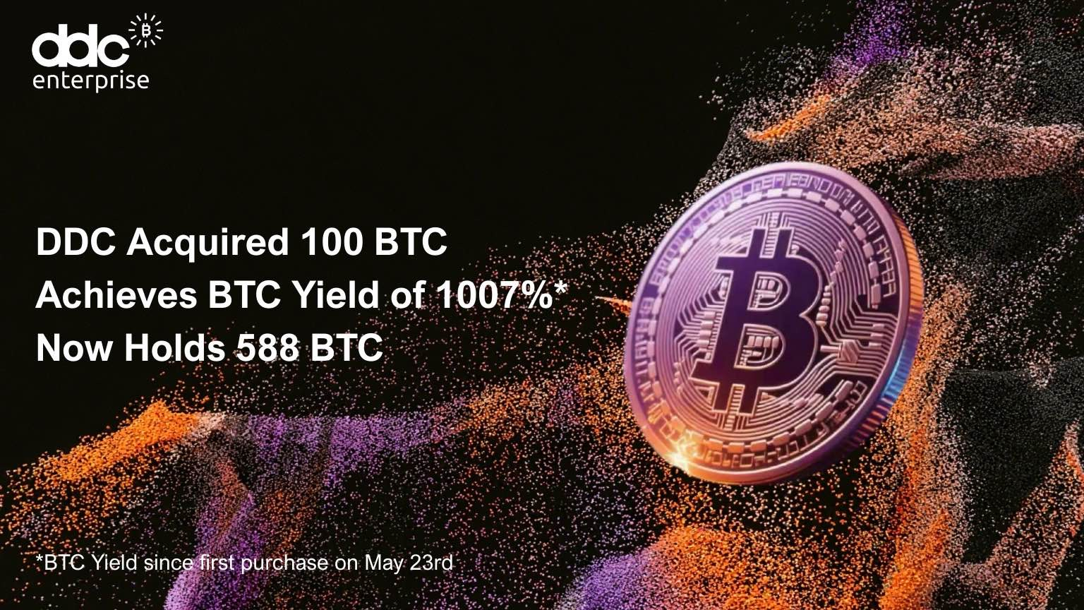 NEW YORK--(BUSINESS WIRE)--DDC Enterprise Limited (“DDC” or the “Company”) today announced the acquisition of 100 Bitcoin (BTC) as part of its ongoing corporate treasury strategy. This marks the company’s second Bitcoin purchase within a week, bringing DDC’s total holdings to 588 BTC. The transaction reflects DDC’s continued execution of its disciplined Bitcoin treasury strategy and long-term goal of building one of the world’s leading public Bitcoin treasuries.