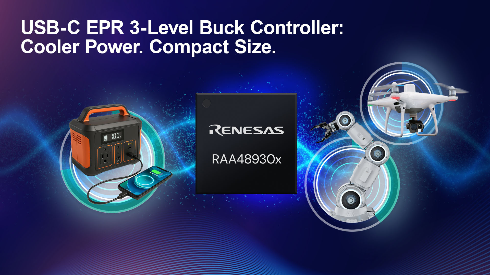 TOKYO--(BUSINESS WIRE)--Renesas Electronics Corporation (TSE:6723), a premier supplier of advanced semiconductor solutions, today introduced the RAA489300/RAA489301 high-performance buck controller designed with a three-level buck topology used for battery charging and voltage regulation in USB-C systems such as multiple-port USB-PD chargers, portable power stations, PC docking station, robots, drones, and other applications that need a high efficiency DC/DC controller.