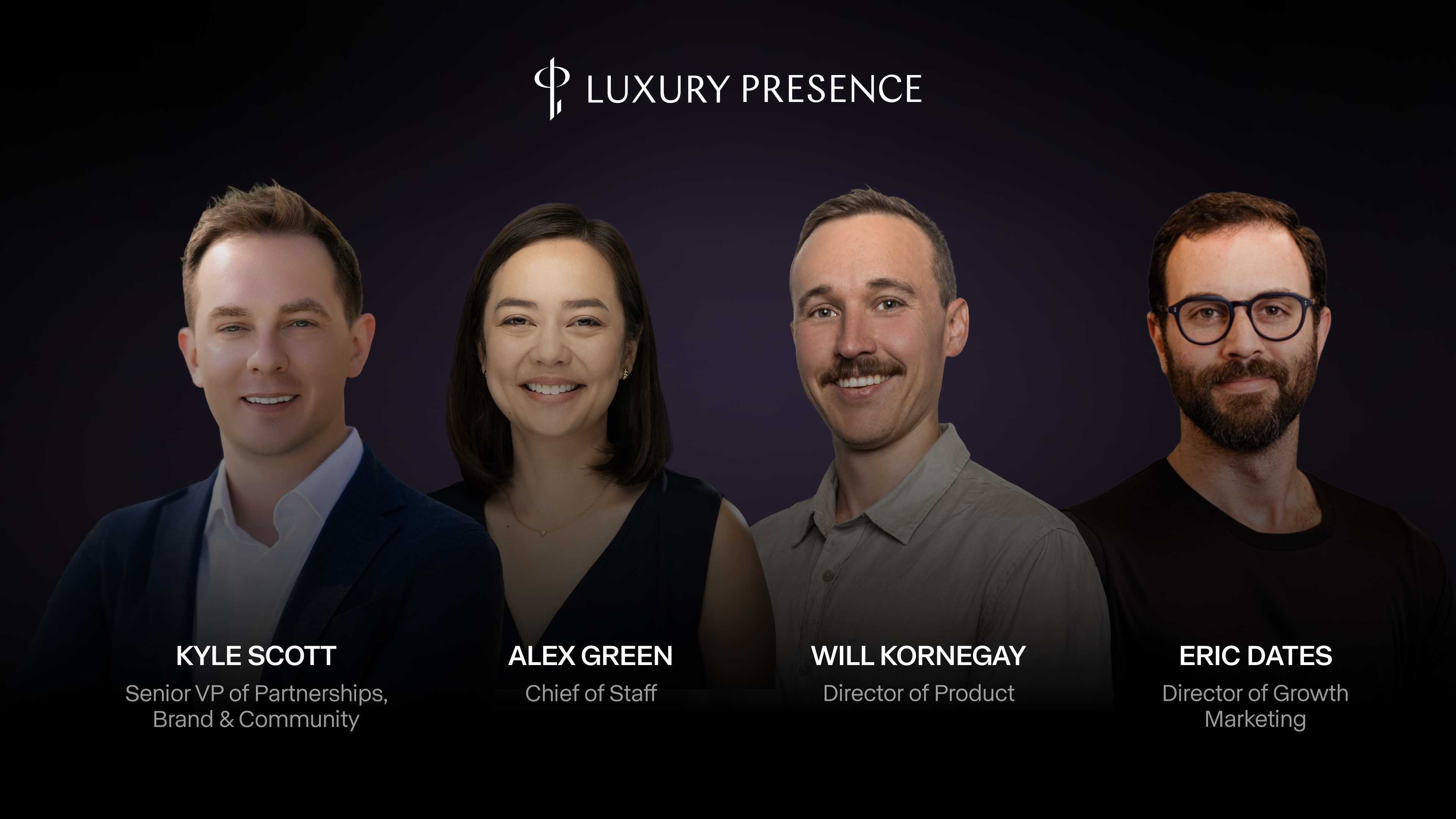 As Luxury Presence surpasses $75M in annual recurring revenue (ARR), the company announces new leadership hires (from left to right): Kyle Scott, Senior Vice President of Partnerships, Brand & Community; Alex Green, Chief of Staff; Will Kornegay, Director of Product; and Eric Dates, Director of Growth Marketing.