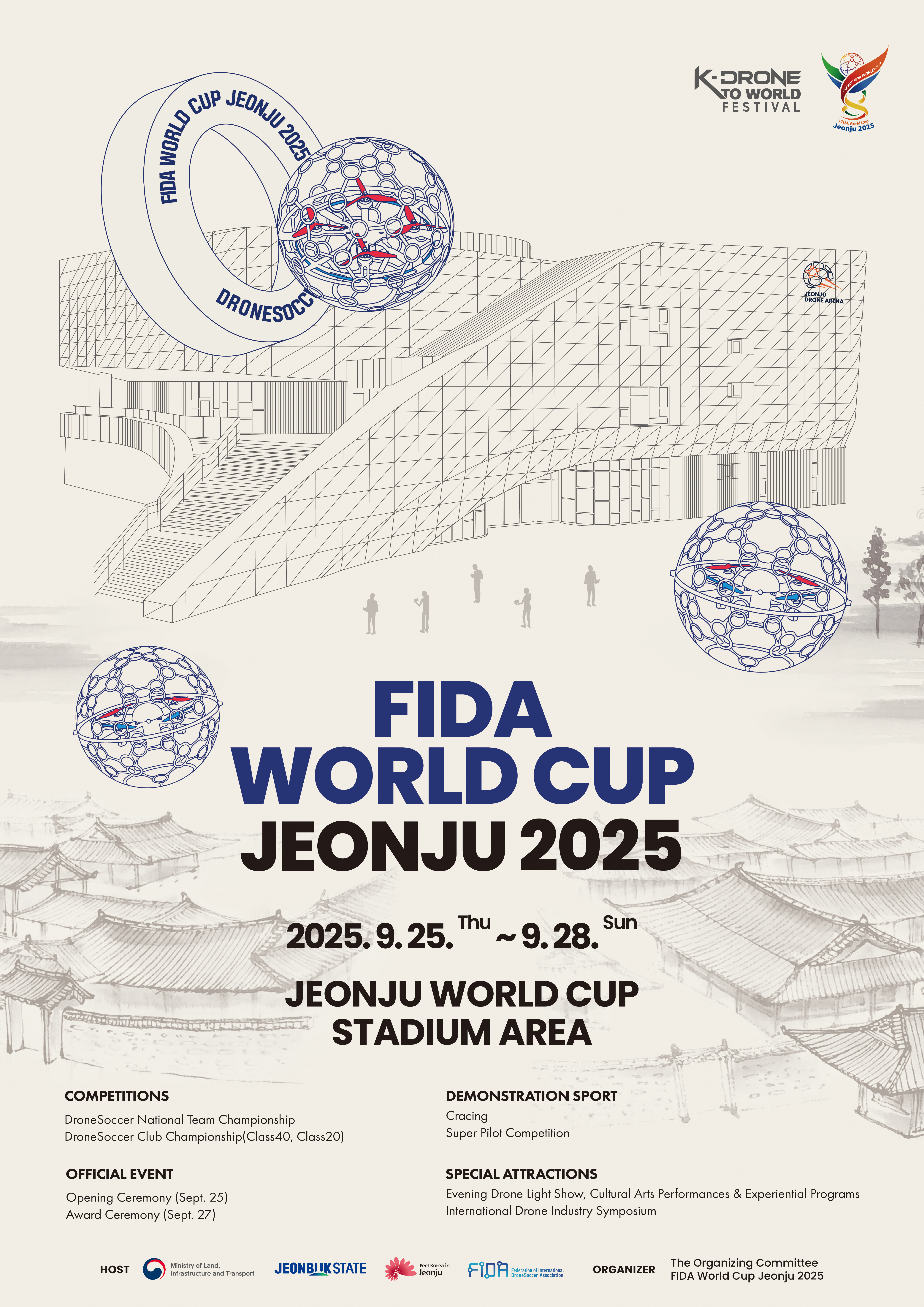国土交通部、全北特別自治道、全州市、そして国際ドローンサッカー連盟が主催する本大会は、9月25〜28日に全州ワールドカップ競技場および周辺会場で開催され、32か国から2,500人以上の選手が参加する予定です。