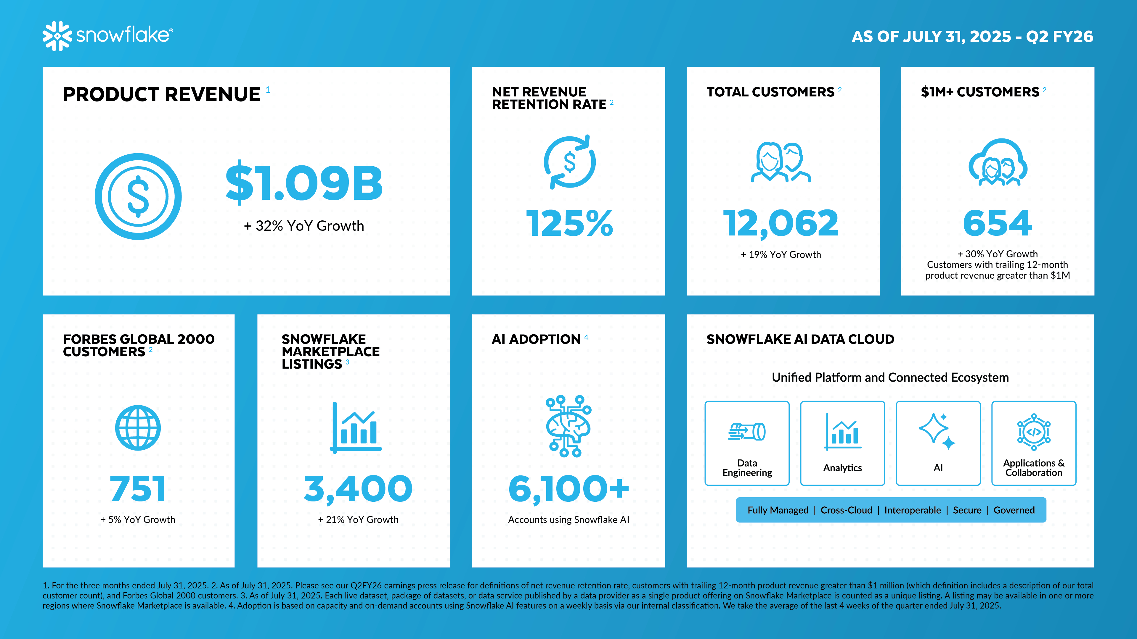 No-Headquarters/BOZEMAN, Mont.--(BUSINESS WIRE)--Snowflake (NYSE: SNOW), the AI Data Cloud company, today announced financial results for its second quarter of fiscal 2026, ended July 31, 2025.