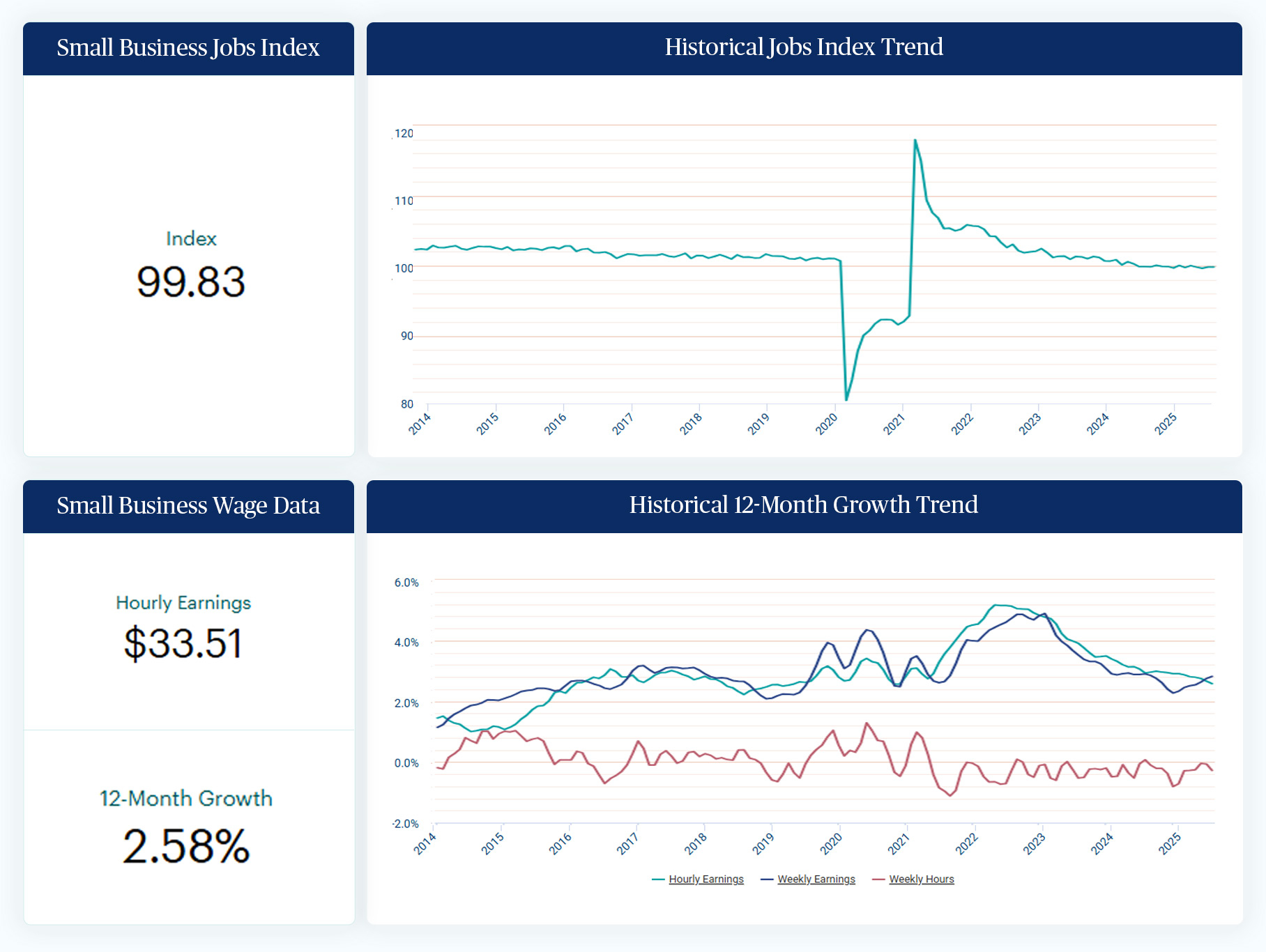 - The national Small Business Jobs Index for August (99.83) was 0.06 percentage points off the pace set in August 2024 (99.89).