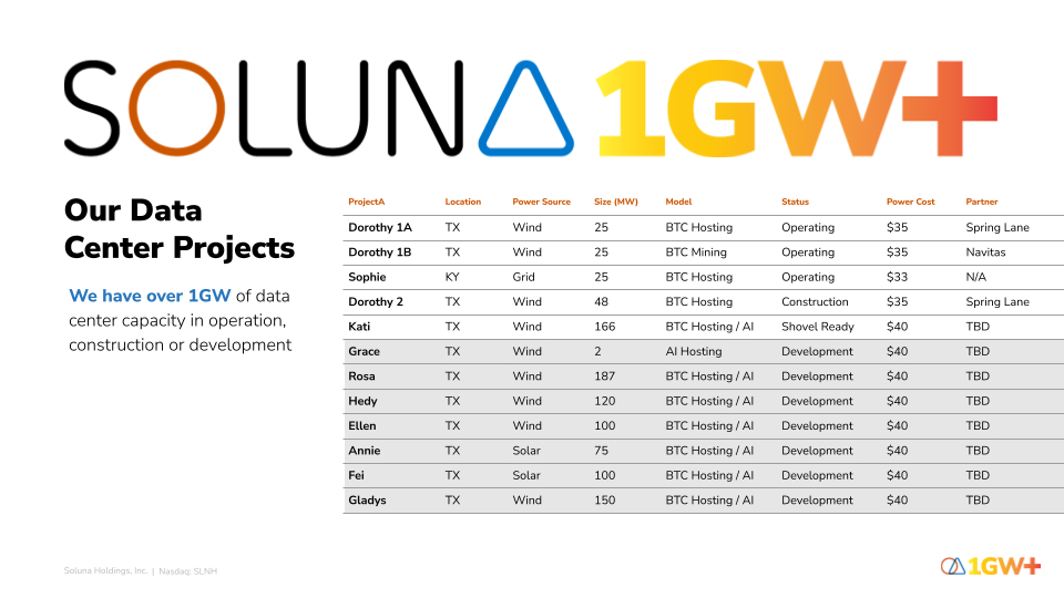 - With the launch of Projects Gladys and Fei, Soluna’s portfolio has surpassed 1 GW of renewable-powered computing in operation, construction, and development.