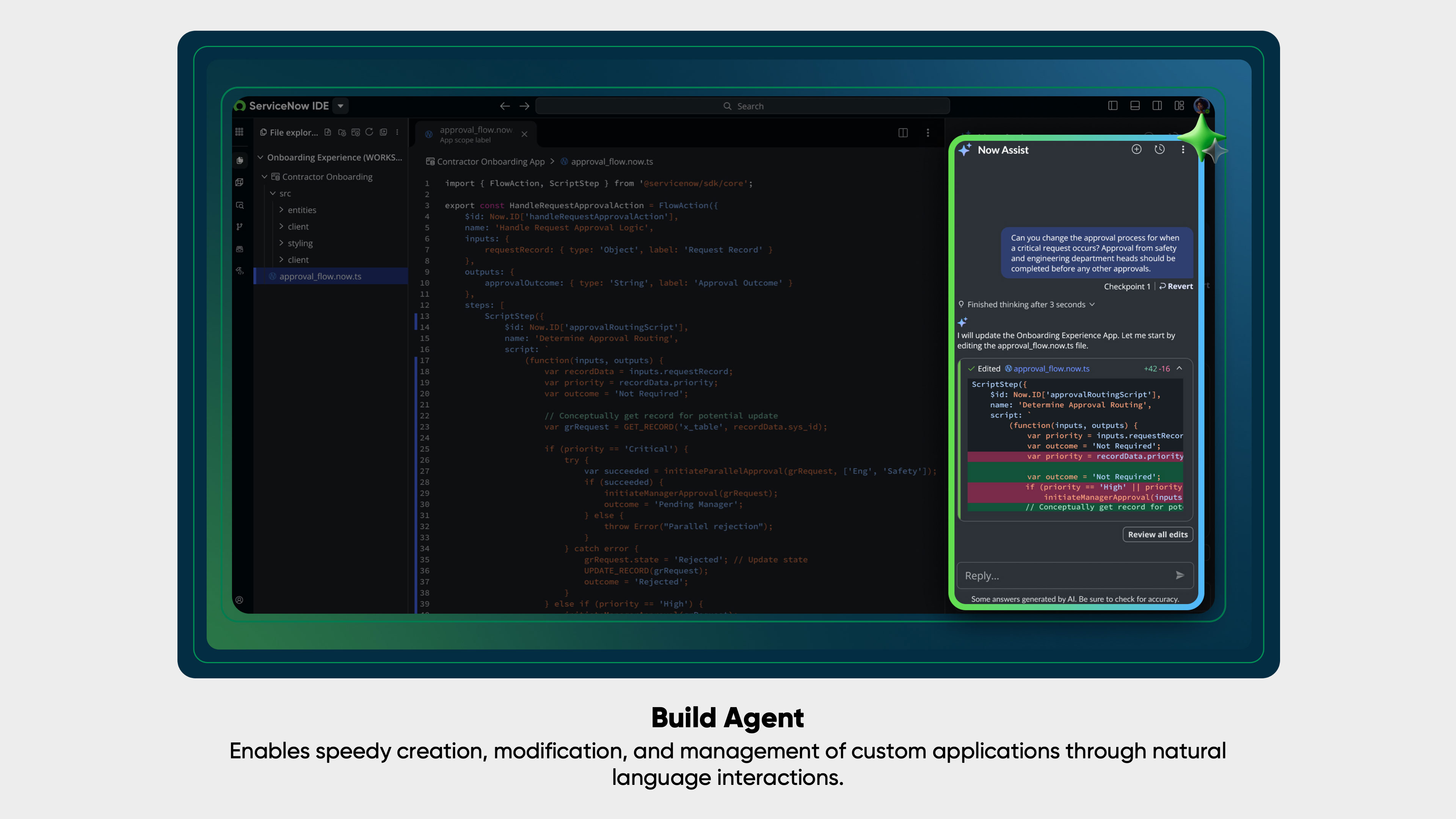 • Build Agent is a breakthrough for enterprise app creation—bringing vibe coding to the rigor of the ServiceNow AI Platform. In seconds, employees can turn an idea into a production-ready application by asking in natural language. Say, “Create an onboarding app that assigns tasks to HR, IT, and Facilities,” and Build Agent handles the rest—design, build, logic, integrations, testing, and industry-leading governance included. What sets it apart is enterprise discipline: every app comes with audit trails, security, and compliance built in. Developers and citizen creators alike get the speed of AI with the confidence of enterprise-grade control, in a streamlined interface.