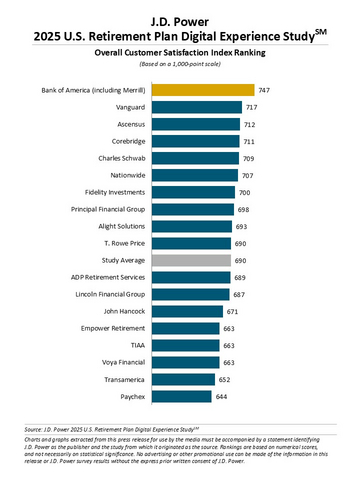 The U.S. Retirement Plan Digital Experience Study was redesigned for 2025 thus overall satisfaction scores are not comparable with previous-year studies. The study measures customer satisfaction with retirement plan websites, mobile websites and mobile apps across four factors (in order of importance): design, system performance, tools/capabilities and information content. The 2025 study is based on responses of 7,151 retirement plan participants and was fielded from May through June 2025.